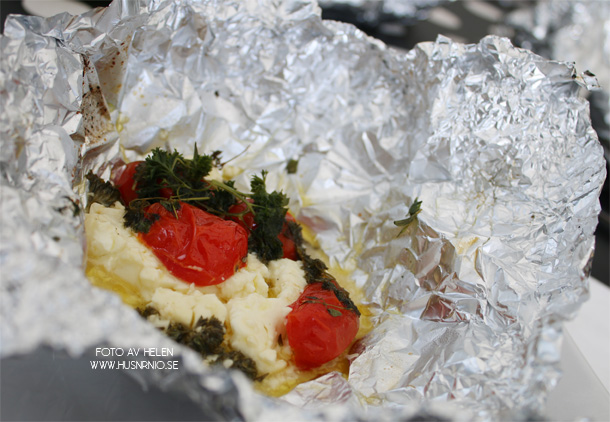 Fetaosten blir sådär mjuk på grillen men ändå inte helt smält. Dofterna när man öppnar foliepaketet är ljuvliga och smakerna likaså.