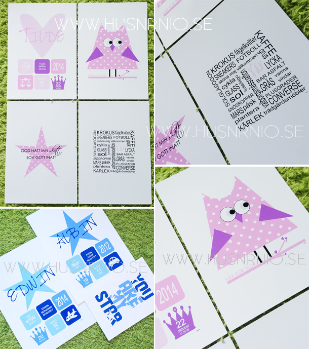 Sen en tid tillbaks gör jag, på beställning, personliga barntavlor, och även tavlor passande till andra platser i hemmet. Förslag på tavlorna hittar ni här på bloggen. HUSnrNIO.se innehåller allt detta i en enda röra kryddat med en massa foton då jag gärna dokumenterar vår vardag genom kameralinsen.
