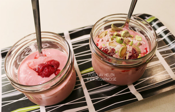 Skeda upp i skålar och toppa med t.ex några hallon, grovt hackade pistagenötter och kokos.