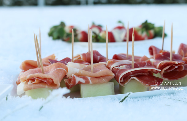 Barnens snittar på nyårsafton finns det bild på här. Halva köttbullar och en halv körsbärstomat samt melonkuber på tandpetare.