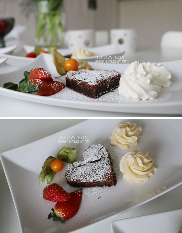 Kritiska lilla dessertkillen gav fikat full pott. Godaste kladdkakan ever, haha, och han berömde så klart upplägget direkt när han såg tallriken. Den killen vet hur man får en mamma att må gott på Alla hjärtans dag han 😉