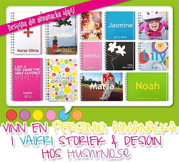 I samarbete med Personlig almanacka har jag fått äran att lotta ut ett presentkort på en almanacka i valfri storlek [välj mellan liten, mellan, stor och A5] och design till er läsare.