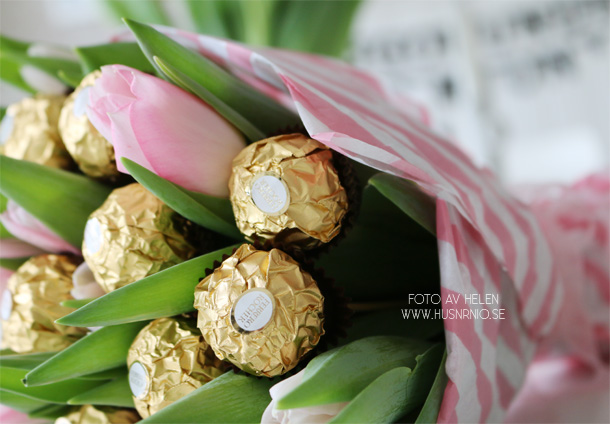 Tulpaner står sig en vecka [perfekt timing till flytten] om man sköter om dem bra och lite extra god choklad kan vara ett måste när man flyttpackar men istället för att ge detta rakt upp och ner så det blev en chokladbukett med underbart ljus rosa tulpaner och lyxig Ferrero Rocher.