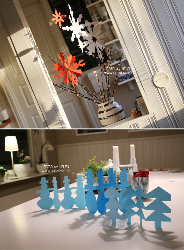 En del av snöstjärnona hängd band jag en sytråd i och hängde upp i köket direkt. Dekorativa och fina och jag tror att M var en smula imponerad över sig själv att det han klippte, som inte alls såg något särskilt ut under själva klippandet, kunde bli så fint när han vikte ut dem.