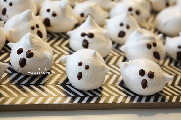 I år fick jag inte en lika fast maräng [provade ett nytt recept från Allt om mat den här gången] som jag annars alltid brukar få. Kanske var skålen inte helt fettfri efter dotterns bakning precis före. Jag valde också att spritsa dem med en slät tyll så de saggade ihop sig något så det blev ett gäng lite knubbigt charmiga spöken.