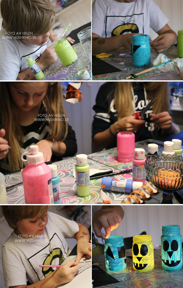 Hur som så hade vi några trevliga timmar tillsammans i lördags kväll kring köksbordet och resultatet av detta blev läskiga Halloweenlyktor som lyser så fint i mörkret och mer ska det bli under den här veckan då jag har förberett lite mer pyssel á la Halloween 🙂