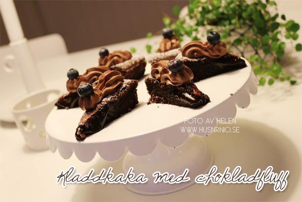 Eftersom kladdkaka är enkelt att slänga ihop och fluffet likaså [vispgrädde, kakao och strösocker har väl de flesta hemma] så ni hinner bjuda på detta till klockan tre fikat om ni är sugna…