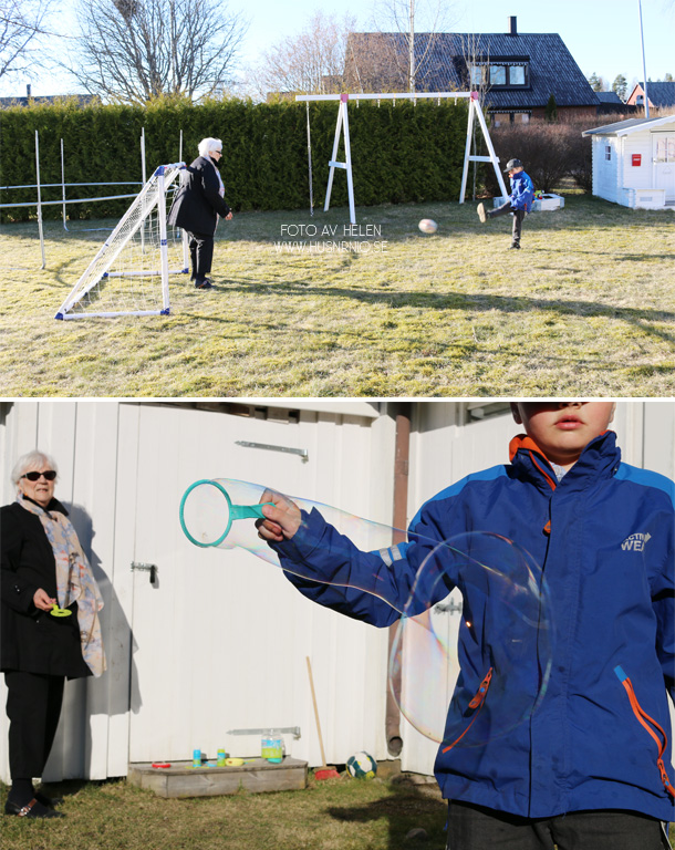 Påskafton blev ändå en fin dag och mellan mat och påskdessert med kaffe så var M och farmor ute och blåste såpbubblor och spelade lite fotboll.