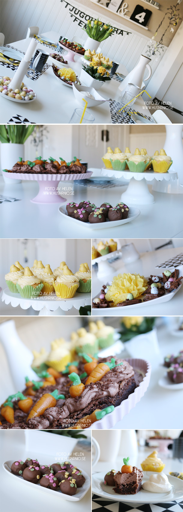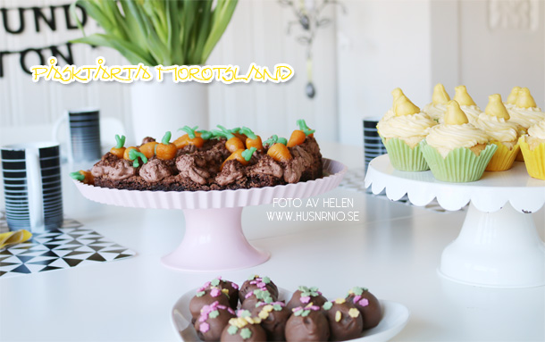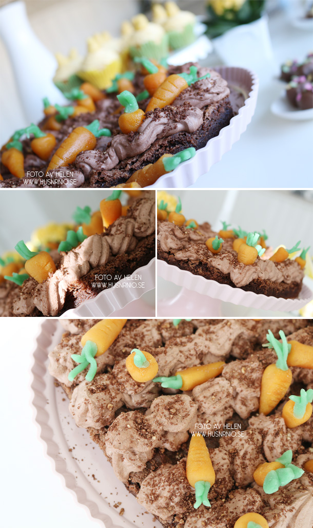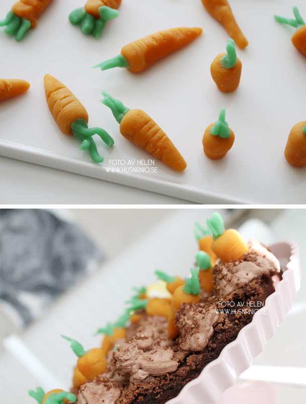 Påsktårtan i år blev en kladdkaka med chokladfluff . Jag inspirerades av Kryddburken som gjort kladdkakemuffins med morötter på och gjorde min egen variant av dessa med kladdka istället som jag skar till så den inte skulle vara helt rund, spritsade chokladfluff ovanpå i rader som jord i ett morotsland, krossade ett digestivekex till småsmulor och jag blandade med lite kakao och strösslade ovanpå chokladfluffet så det såg ut som mer jord och sen stack vi ner och la dit alla våra små morötter som jag och M gjorde av mandelmassa . Den blev väldigt god den och dess utseende uppskattades 🙂