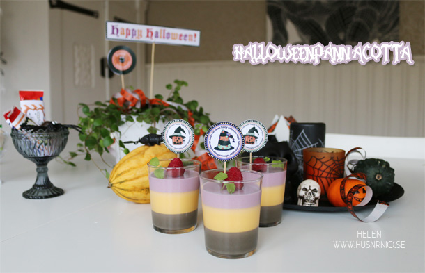 Läskigt läcker och god Halloweenpannacotta med tre spännande lager. Ser kanske inte helt gott ut men det är bara färger. Halloweenpannacottan har smaker av mjölkchoklad, vit choklad och vanilj och hallon.