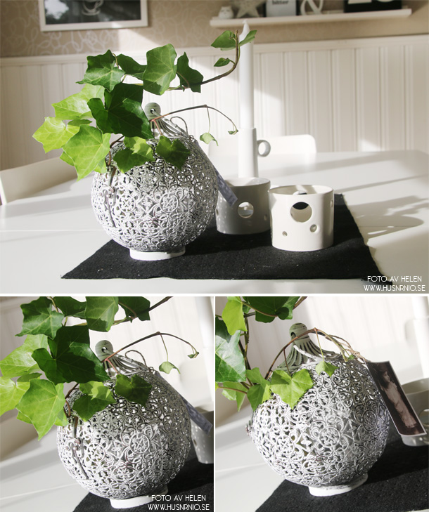 Ny söt ljuslykta på matbordet i köket som jag fick av min moster i födelsedagspresent för någon vecka sen. När jag fick den var det blommor och murgrönakvisten ovan i men blommorna har hunnit vissna ner. Murgrönan, som sitter i en liten vattenbehållare inne i ljuslyktan, låter jag sitta kvar där ett tag till. Sen ska de planteras och ljuslyktan tändas men just nu är den så fin så här.