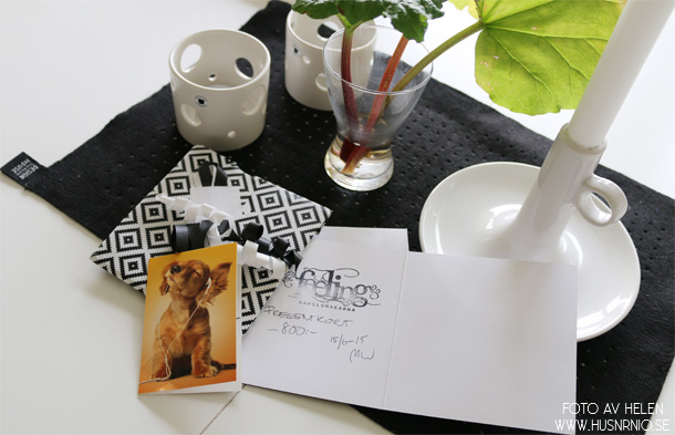Ett gulligt kort med en hund så klart eftersom alla känner till mitt numera liv som går under benämningen hundliv och ett presentkort på underbara butiken Feeling.