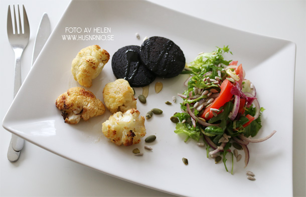 Servera blodpuddingen tillsammans med den rostade blomkålen och en sallad. Jättegott att toppa sallader med solros- och pumpakärnor.
