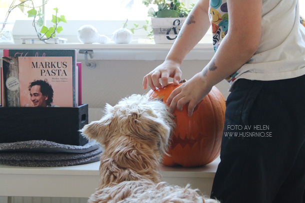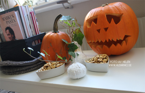 Nu är pumpakärnorna uppätna och pumpan väntar på att placeras ut. Tiden räcker inte riktigt till för mig just nu och det är förvånansvärt att det är något hela tiden och trots att jag stressar och sover ganska få timmar per natt så hinner jag ändå inte beta av allt och framförallt att göra saker som är lustfyllda och roliga, som att dekorera och pyssla t.ex, hamnar en bit ner under allt annat för tillfället. Hoppas på något mindre fulla dagar så småningom.