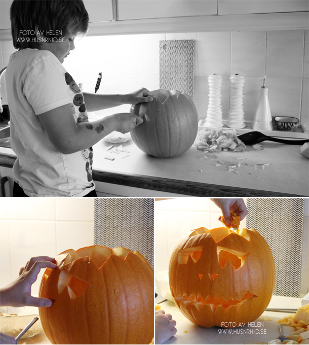 Jag snittade och medans jag pysslade med pumpakärnorna så avlägsnade M allt fruktkött. Han kallade det pumpans hjärna och levde sig in för fullt i sitt uppdrag. Kanske en blivande hjärnkirurg… 😉