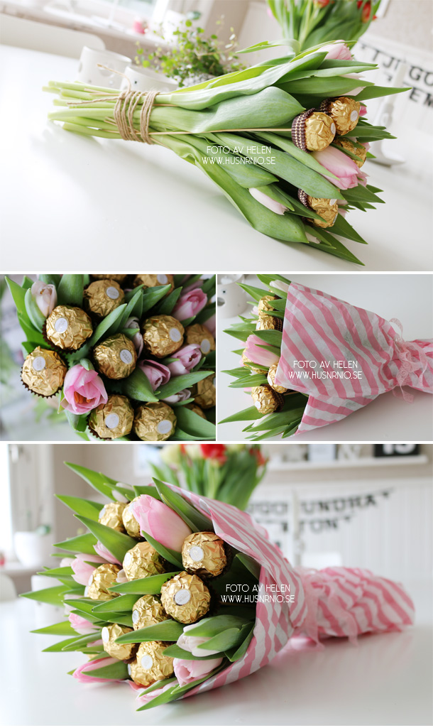 Tulpaner står sig en vecka [perfekt timing till flytten] om man sköter om dem bra och lite extra god choklad kan vara ett måste när man flyttpackar men istället för att ge detta rakt upp och ner så det blev en chokladbukett med underbart ljus rosa tulpaner och lyxig Ferrero Rocher.