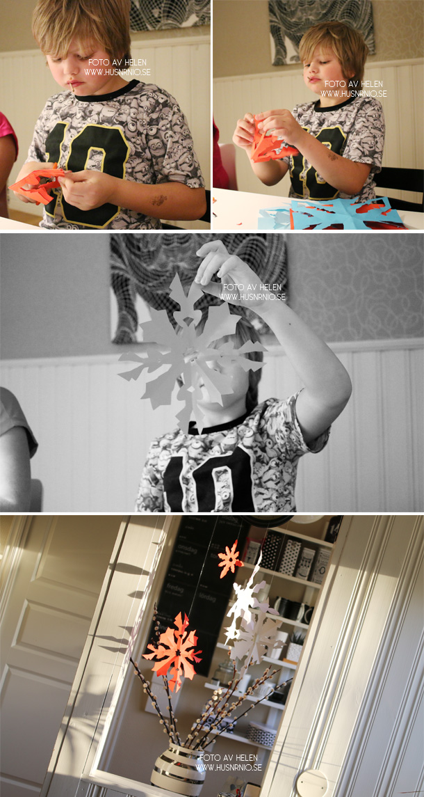 En del av snöstjärnona hängd band jag en sytråd i och hängde upp i köket direkt. Dekorativa och fina och jag tror att M var en smula imponerad över sig själv att det han klippte, som inte alls såg något särskilt ut under själva klippandet, kunde bli så fint när han vikte ut dem.