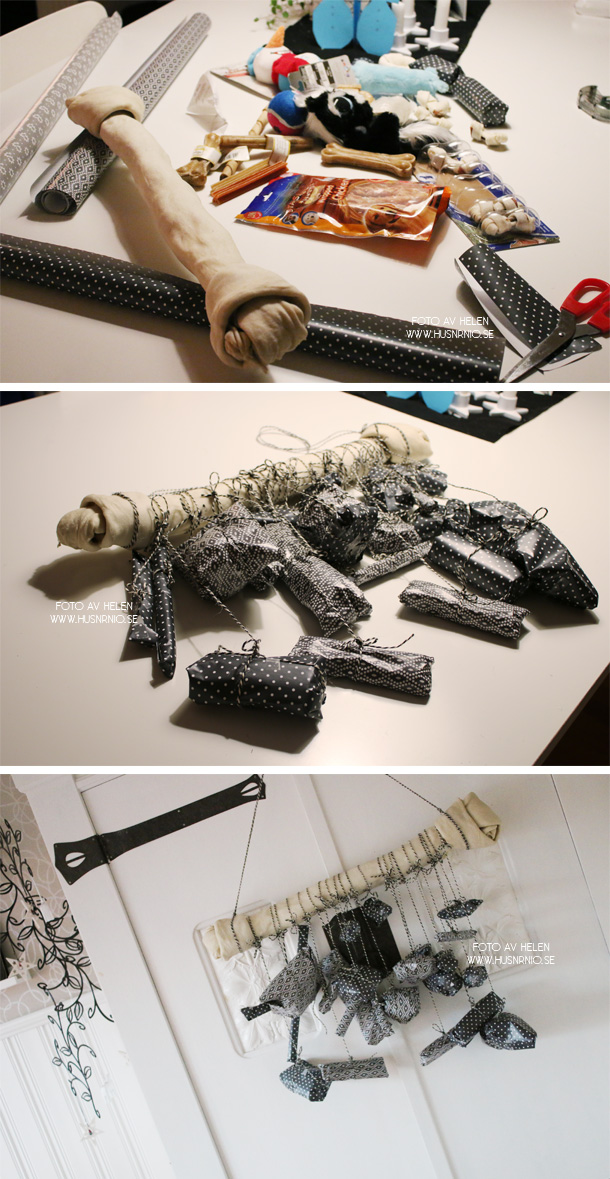 En del saker köpte jag styckvis som små hundben i olika storlekar, smaker och färger, jag köpte även två förpackningar med olika ben som jag sen öppnade och slog in ett i varje paket.