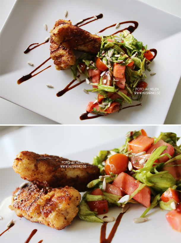 Jag var inte alls sugen på mos utan åt min fisk med en sallad gjord på grönt från pallkragen, körsbärstomater och vattenmelon samt lite solrosfrön.