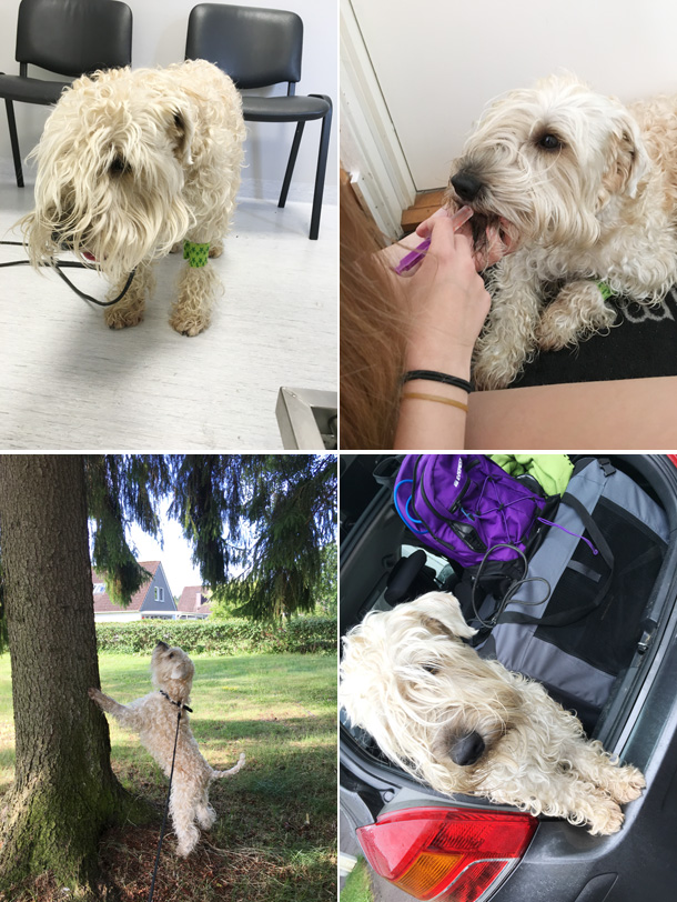 Vid tvåtiden stod jag inte ut längre och försökte få en tid hos veterinären till honom. Hos den tredje kliniken jag ringde fick vi en tid och sen kastade vi oss iväg.