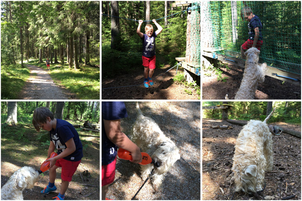 Jag och grabbarna promenerade iväg till skogen. Sval grön skog och kvittrande fåglar var mysigt tyckte de båda.